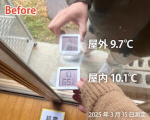 解体前の測定では、室外温度が9.7℃のとき、室内温度は10.1℃と暖房をつけていても外気とほぼ変わらない状態でした。