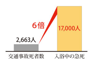 冬場の浴室で発生しやすい、ヒートショックと考えられる年間の死亡者数は、約17,000人以上とされています。これは、2024年の全国交通事故死亡者数(2,663人)の、およそ6倍以上にももぼります。